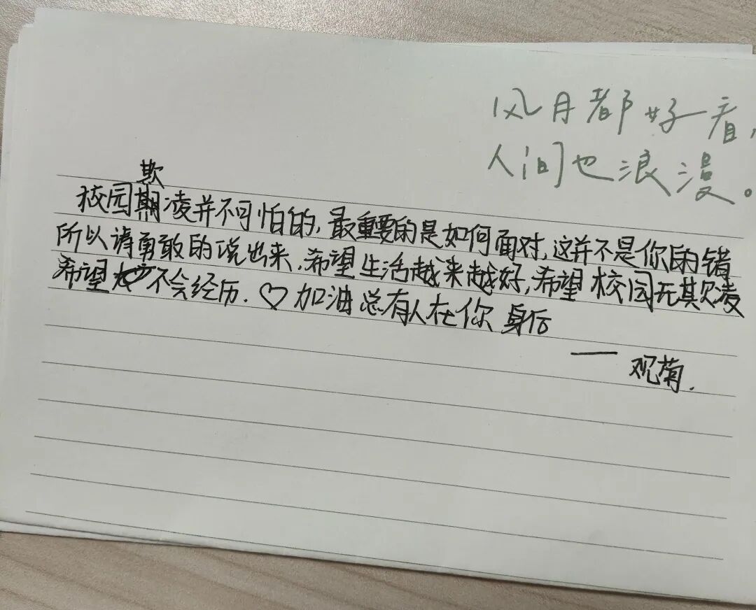 在这次的开放日中,有十五位礼嘉中学的学生志愿者参与其中,积极做校园反欺凌宣传。在整理信箱时我们发现有一些投递者是曾经的校园欺凌旁观者,他们有些讲出了曾经看到过欺凌事件,有些后悔当初没有制止,还有些写了很多鼓励支持的言语并表示自己可以成为欺凌者的后背。