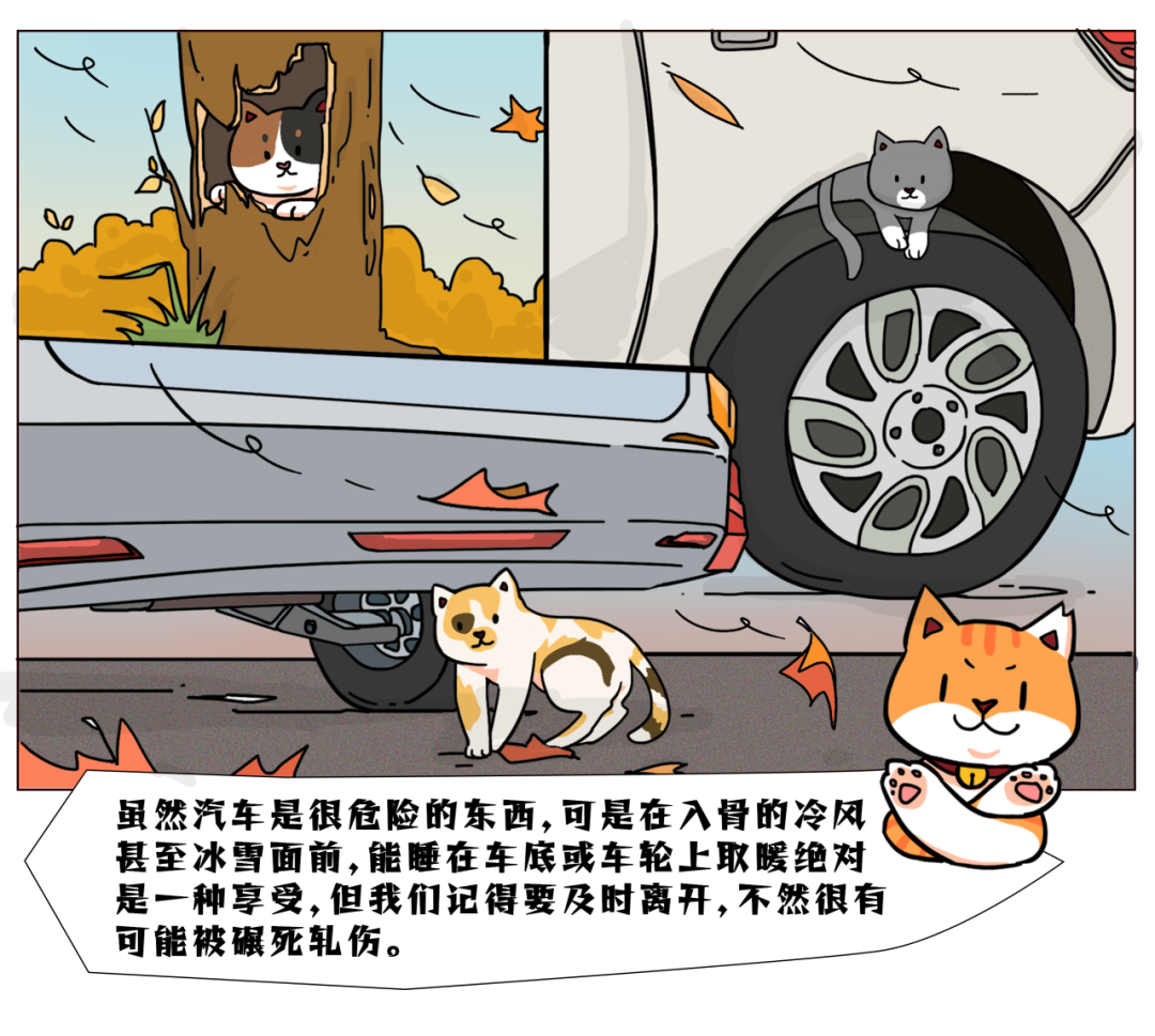 此外,虽然汽车是很危险的东西,可是在入骨的冷风甚至冰雪面前,能睡在车底或车轮上取暖绝对是一种“享受”,但我们记得要及时离开,不然很有可能被碾死轧伤。