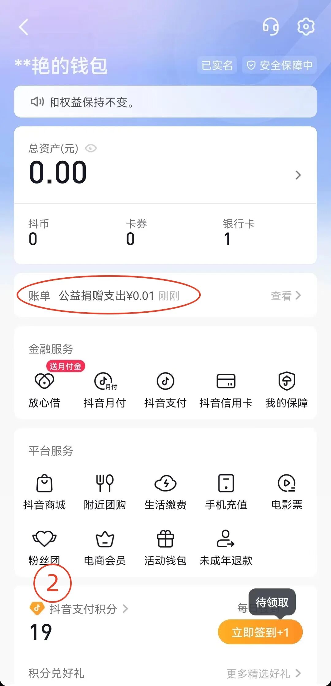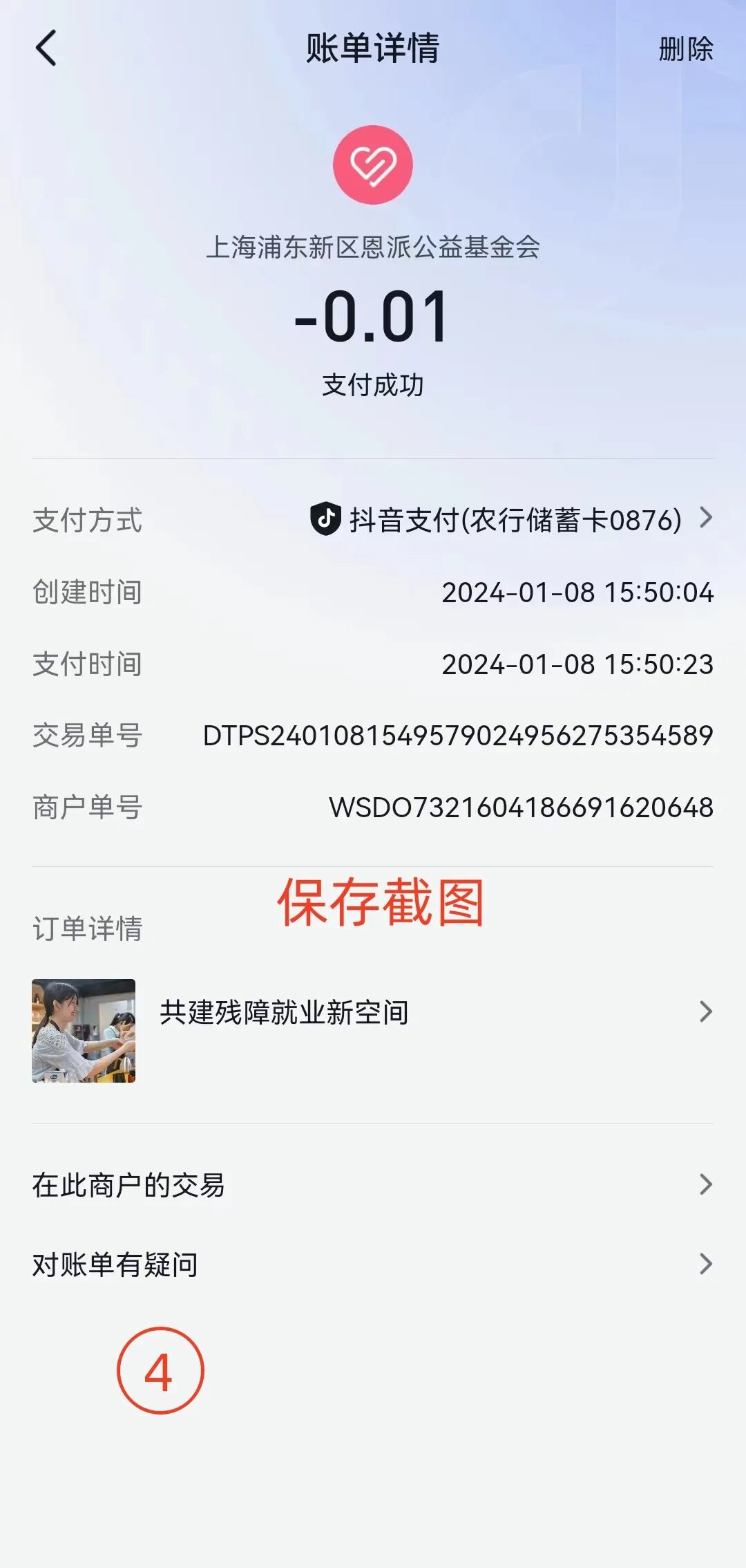 抖音支付:进入抖音APP——点击右下角“我”——点击“我的钱包”——点击“账单”——点击交易方式“抖音支付”——找到此笔捐赠点击进去——看到【交易单号】后进行截图保存。
