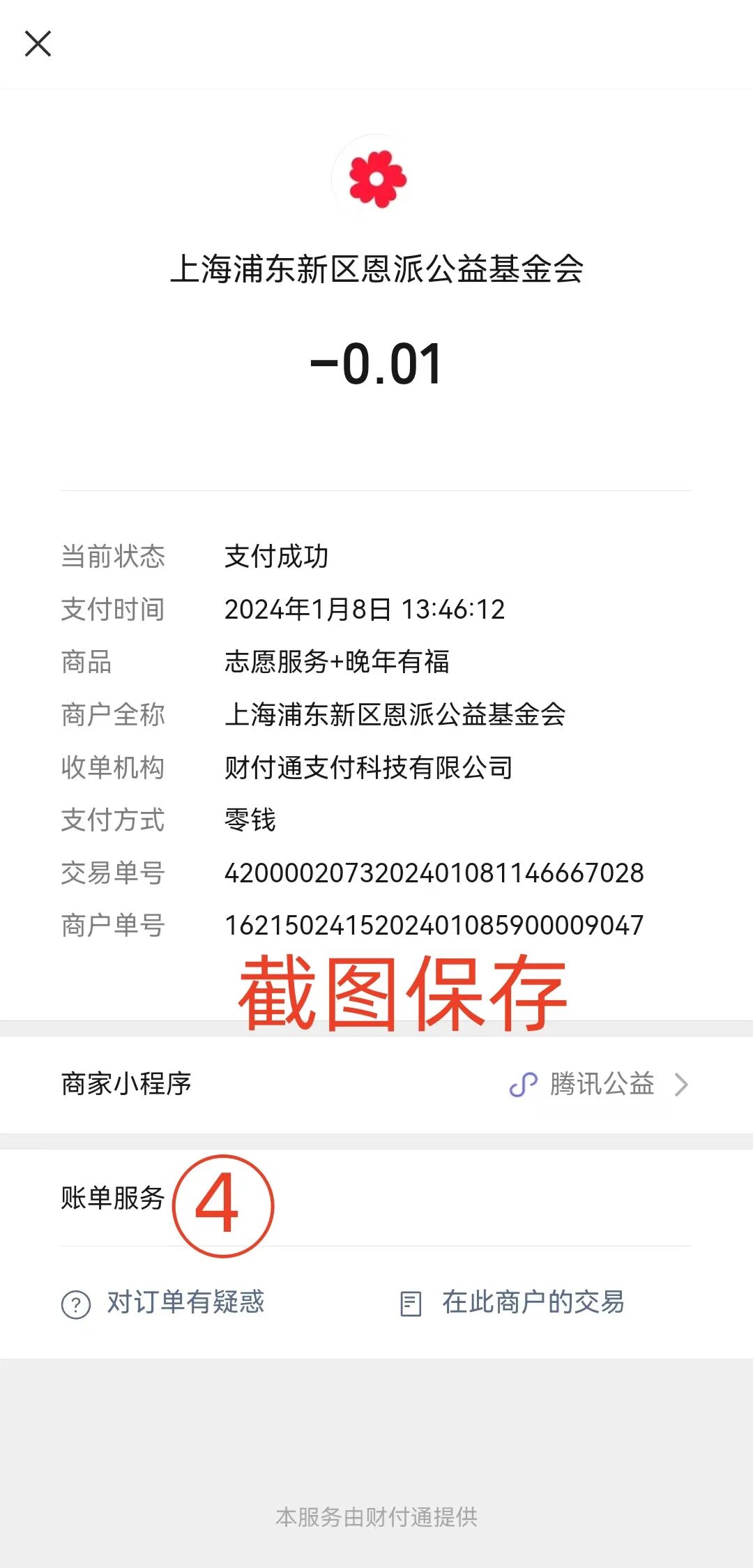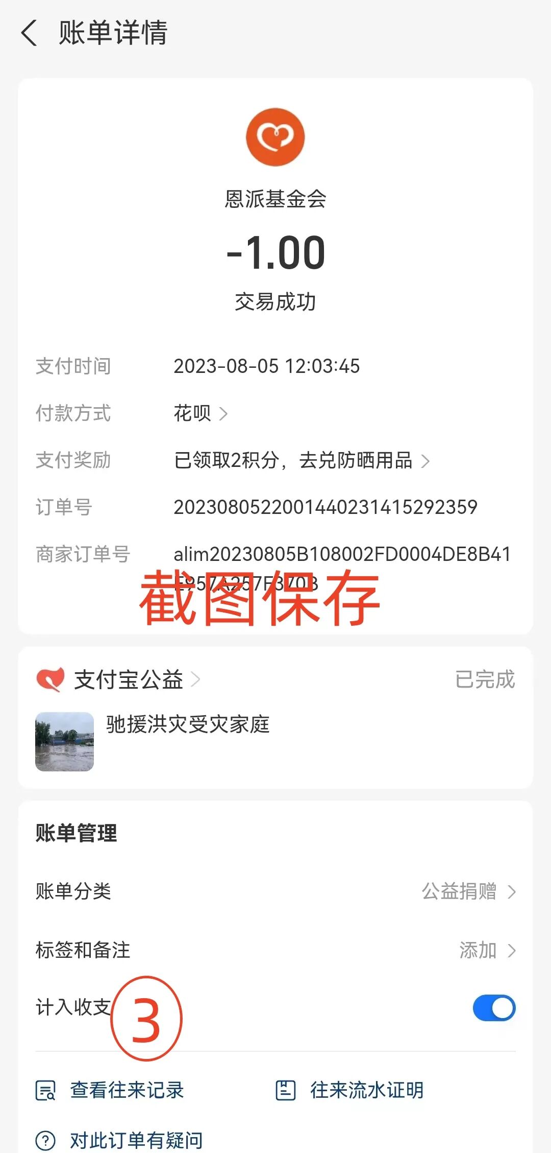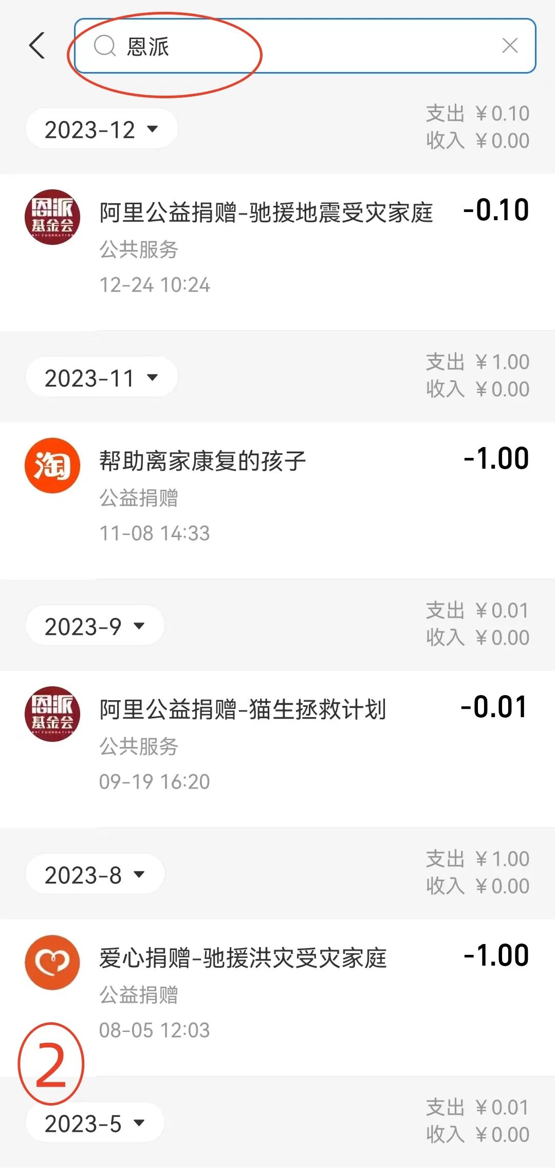 支付宝支付:进入支付宝APP——点击右下角【我的】——点击【账单】——搜索“恩派”——找到此笔捐赠点击进去——点击【更多】——看到【订单号】后进行截图保存。
