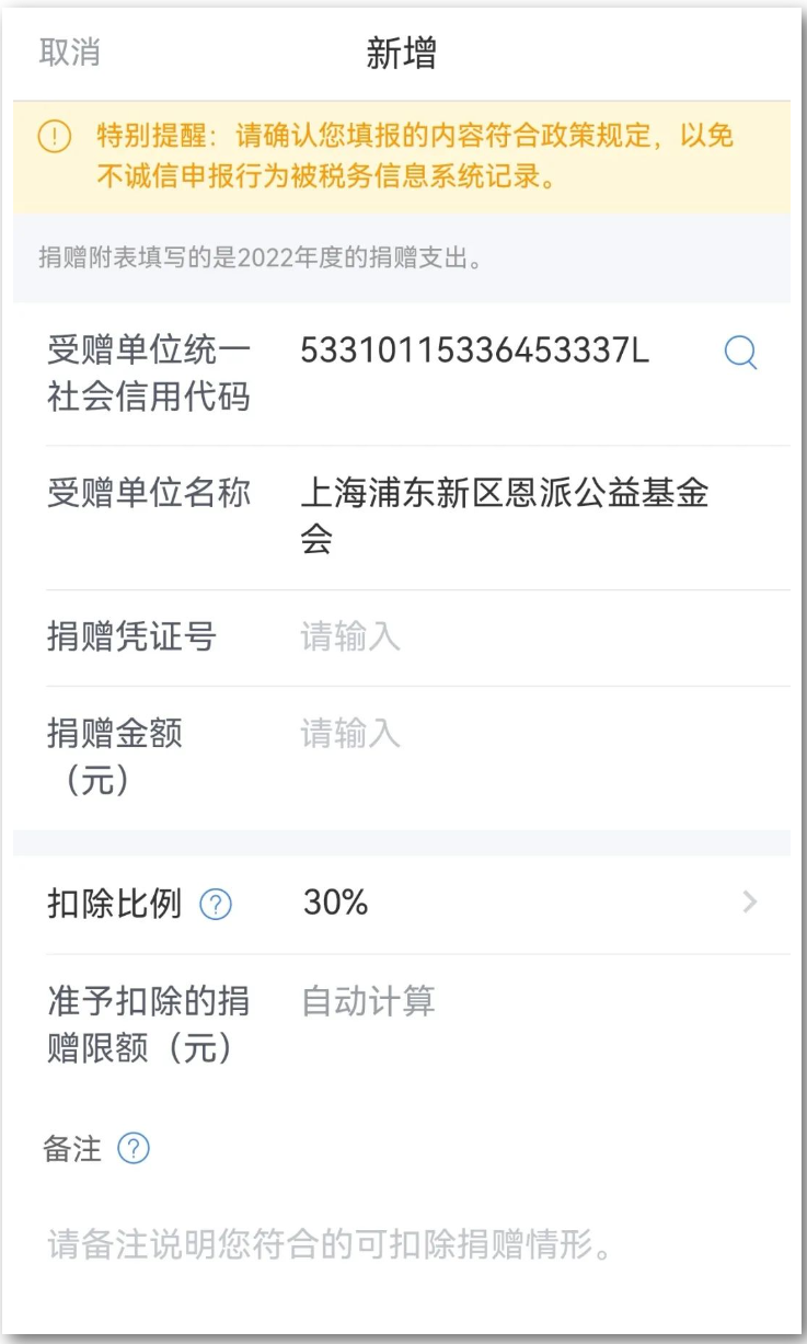 第三部:请对照准备好的捐赠票据,填写相应信息。若有多张捐赠票据,请逐一添加。完成所有添加后点击【分配扣除】;